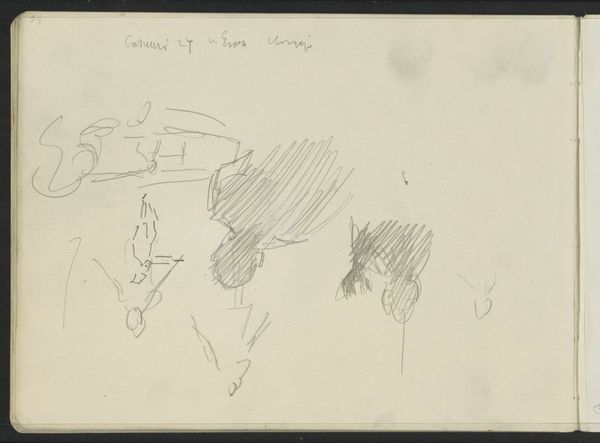 Curator: Right, let’s consider this intriguing double-sided work by Paul Gauguin. It’s titled "Head of a Monkey; Inventory of Bottles and Beverages [verso]", dating from between 1884 and 1888. It's rendered in pencil on paper. Editor: My first thought? It's delightfully chaotic. The sketch on the left feels like a landscape fighting to emerge from a fog of uncertainty. And the one on the right, the supposed "inventory," reads like a map to a slightly deranged adventure. Curator: Indeed! The "landscape" is sparse, almost primal in its simplicity, but within it, notice how elements suggestive of cages, the implied primate figure…they begin to evoke a sense of confinement and observation, almost as if hinting at Gauguin's later fascination with the exotic "other". Editor: The monkey head, if that’s what it is, looks more like a disgruntled potato. And those bottles—unless Gauguin had a penchant for drawing topographical maps of his beverages—are far from straightforward representations. What kind of drinks are we talking about here? Mystery Juice #1? Curator: Ah, there's the beauty of it! The text seems like notes on places he has been like Hamburg and Cologne; “visite de Douane” – customs visit in Hamburg; an interesting parallel with how, later, Gauguin self-consciously constructs his own identity as outsider, "savage," always seemingly at the edge of accepted society. Even, as the title suggests, somewhat confined…as if this page captures him struggling for artistic and social freedom? Editor: Or perhaps he was simply bored waiting in customs! It’s that raw energy of a creative mind just spilling thoughts onto the page that draws me in. It is not a masterpiece but a backstage pass into the studio. Curator: Perhaps. And what fascinates me, too, is seeing in it all, a very clear echo of symbolism he would later come to define as "synthetism." This piece anticipates that distillation of emotion into image. Editor: Hmm. For me, I see not a prophecy but a diary entry from an interesting, though at this moment rather under-caffeinated, individual. Curator: Regardless, it gives us a very revealing intimate snapshot into the genesis of his work…the mind of Gauguin at play. Editor: Precisely. A doodle that hints at the volcano of artistic exploration about to erupt. Now I really need that Mystery Juice…