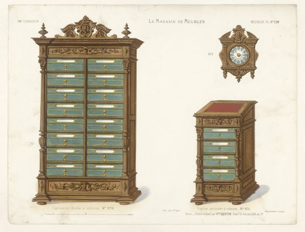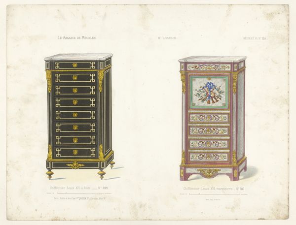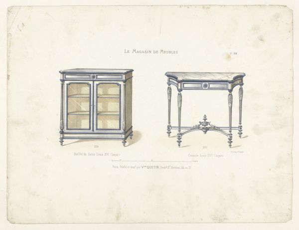 Curator: This print, titled "Boekenkast en ladekast," likely served as a catalogue plate. The details are exquisite. Editor: Oh, it's giving me serious belle époque vibes. Imagine a grand salon, all dark wood and shimmering gold leaf, filled with secrets. Curator: Indeed. Dating from the period of 1832 to 1877, this anonymous piece beautifully captures the essence of decorative arts and leans heavily into neoclassicism with distinct lines. Editor: The gilded details are striking. It’s funny how a simple drawing of furniture can evoke such a specific mood. I'm suddenly picturing myself as a brooding poet, penning verse in a dimly lit study surrounded by such objects. Curator: I see how the use of line creates depth, yet it’s somewhat constrained by the dictates of formal presentation. Editor: Constrained, maybe, but effectively so! Notice the almost theatrical quality. It's not just furniture; it's a stage setting for dramas untold! The tension between shadow and shimmer elevates them into the symbolic and narrative. Curator: I agree that shadow and light are important factors to its appeal, although the organization of the print reflects its practical application for commercial dissemination rather than pure artistry. Editor: Oh, absolutely. Still, there is artistry here too! It reminds us that beauty and function can coexist, sparking an interest in how the things we use every day reflect our inner lives. Curator: Precisely. Looking at the way line and decorative detail intertwine, I recognize more fully the impact of period design in forming collective historical perspectives. Editor: And sometimes all it takes is a little gilded detail to awaken an entire narrative.