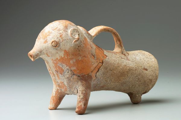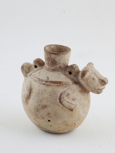 Curator: Welcome. Before us is "Whistle (zoomorphic)", a ceramic earthenware sculpture hailing from the Indigenous Americas. Its date is, regrettably, unknown. Editor: It's deceptively simple, isn’t it? At first glance, I find its stillness… unsettling, almost haunting. The rudimentary form, coupled with the worn surface, conjures a sense of lost stories, of voiceless histories begging to be heard. Curator: Indeed. Observe how the artist has reduced the animal form to its most essential geometric components. The spherical eyes, the cylindrical body, the triangular head, all contribute to a distilled representation. The coarse texture, achieved through the inherent properties of the ceramic, enhances its tactile and visual interest. Note the subtle shifts in color, and the almost granular feel of the glaze or lack thereof. Editor: Yet the beauty is in its perceived imperfection, or so I contend. The erosion speaks of time, ritualistic practice, and lived experience within its societal structure. Imagine the hands that molded this creature, the breath that may have passed through it—a connection to ancestral knowledge and cultural memory. Did it serve a decorative or functional role within society, and did its existence offer its handler status? Curator: Precisely. This ceramic animal departs from purely mimetic representation, and tends towards a formal abstraction. We might contemplate how the interplay of form and texture create a tension between representation and symbolic content, or attempt to see an element of ritualistic purpose by inferring possible ceremonial usage. Editor: The lack of defined details—what species might this represent?—encourages projecting meaning and values. Perhaps the lack of taxonomic clarity suggests a belief system where humans existed on more mutual, or equitable, footing with the broader natural environment? Perhaps this object functioned as a symbol of tribal identity and power and can function as a focal point in political analysis? Curator: An intriguing proposal. It invites reflection on the expressive capacity inherent in a highly reduced form. The animal subject suggests links to cultural practices and visual vocabularies that demand contemplation in our increasingly fast-paced culture. Editor: Agreed. Ultimately, the power of “Whistle (zoomorphic)” lies in its ability to evoke a sense of continuity and belonging within its society and those that succeeded. I daresay, this small thing has a lot to say, especially within larger geopolitical dialogues.