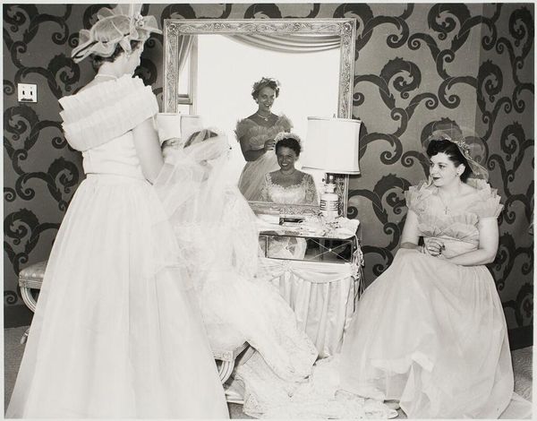 Curator: This photograph, taken by Martin Schweig in St. Louis, Missouri, captures a bride and her mother. There’s no title or date associated with the image, but it's a rather poignant snapshot. Editor: It's like a tableau of impending change. The bride is luminous, while the mother exudes a bittersweet joy, a holding on and a letting go simultaneously. Curator: The doll on the dresser, dressed in a miniature bridal gown, echoes the bride herself. It's a potent symbol of innocence, perhaps a past self the bride is leaving behind. Editor: And the portrait on the wall— is that the mother when she was younger? It adds another layer, a visual rhyme across generations, a reminder that this moment has echoes. Curator: Indeed. One is reminded of the cycles of life and love, the transmission of values, and the continuity between generations. The photograph memorializes an important cultural ritual. Editor: It makes you wonder about their stories, doesn’t it? About the lives lived and the dreams being carried forward. Curator: It does, and in that sense it captures something essential about family bonds and traditions. Editor: A beautiful observation, reflecting a quiet moment of momentous change.
