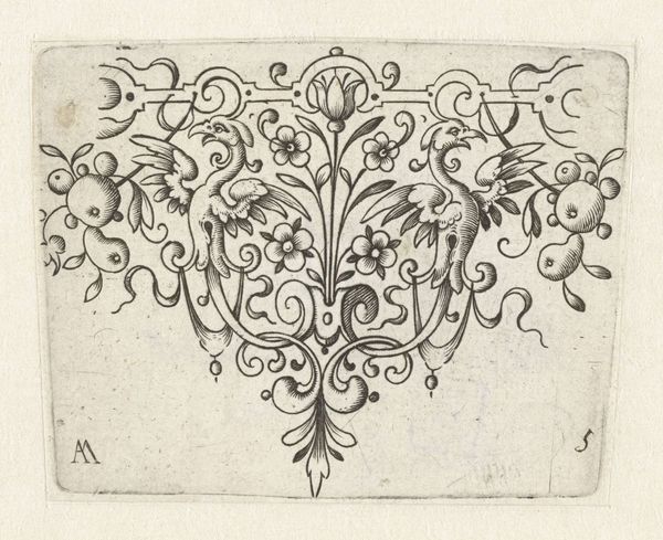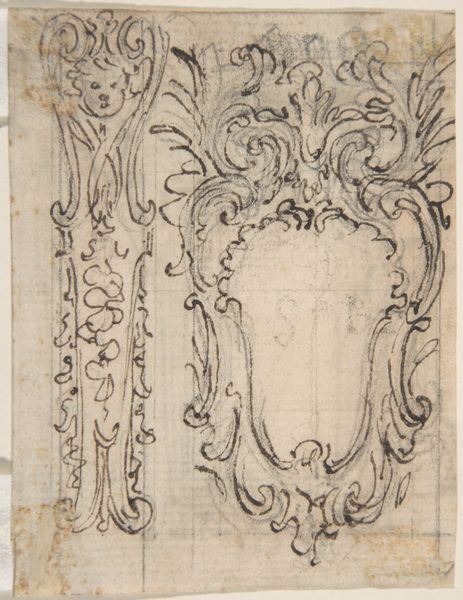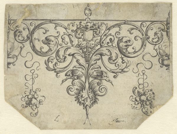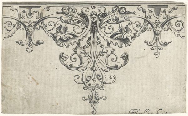 This is H. Picart's "Randornament met twee dolfijnen," a delicate drawing rendered in ink. The composition is dominated by symmetrical, curvilinear forms that suggest a crest or a decorative frieze. The use of line is precise and controlled, creating a sense of intricate detail within the compact space. Notice the dolphins themselves, stylized almost beyond recognition, facing each other across a central floral motif. They sit perched above supporting elements that curve downward in a cascade of ornamental flourishes. The composition is structured around mirroring elements, giving it a formal, almost heraldic quality. The drawing functions as more than mere decoration, it presents a system of signs and symbols. The symmetrical arrangement invites us to consider the balance and order. It reflects a cultural fascination with heraldry, nature, and the decorative arts. The precision suggests a world where even the most fantastical elements are subject to rational design.