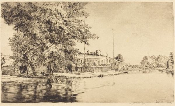 Curator: David Young Cameron's etching, "Laleham," created in 1901, offers a fascinating view into the artistic trends of the time. Editor: It's quite somber, isn't it? The monochromatic palette and dense clusters of lines create a really melancholic feel. Curator: Absolutely. The starkness serves a purpose, channeling late 19th-century anxieties about industrialization and the changing rural landscape. The trees become almost looming figures. What sort of materials or practices might reflect such anxieties? Editor: Well, as an etching, "Laleham" is mechanically reproduced. This highlights a departure from unique handcrafted artworks while using old-fashioned techniques to depict a pastoral scene—note the shadows, built through tiny etched lines, seemingly by hand, yet originating from a printing press. It underscores a tension between craft and the burgeoning world of mechanized production. Curator: Indeed. Furthermore, Cameron’s precise, almost architectural lines evoke a sense of order disrupted. Consider how the lone tree, contrasted against the flat water and land, gains emotional weight within that disruption. Is that landscape wild or carefully manufactured? Editor: That balance is key. And Cameron doesn’t shy away from texture. See the way he works the foreground, almost as if he were digging into the copper plate to create these rough surfaces that look very different from those trees reflected in the water. Curator: You’re spot on; the water mirrors both reality and an idealized past. The reflections hint at tranquility, a visual echo of the idyllic rural life threatened by modernization. Editor: Looking closely, it also reminds us how accessible prints were, or at least, could be, thanks to relative affordability, to working-class households; even as those populations found their rural economies devastated. Curator: Precisely. “Laleham" invites reflection on our relationship with progress, tradition, and the symbols we project onto the natural world. Editor: And to examine how printmaking serves both commerce and, in this case, as a lens for mourning.