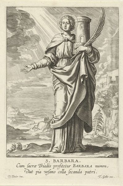 Curator: Ah, the chill elegance of 18th-century allegory. What do you make of this piece? Editor: An air of serene contemplation! The light feels almost liquid, washing over everything with such purposeful calm. It's all in the fine detail of the lines, wouldn’t you say? Curator: Absolutely. This engraving from 1713 is titled "The personification of Christian poetry being inspired by divine love," created by Bernard Picart, part of the Rijksmuseum collection. The technique involves pen and engraving on paper, very typical of the era. Editor: Christian poetry—isn’t it curious how they visualized the divine spark then? We have the figure of Poetry, almost swathed in that luminous cloak of creativity, while the divine love manifests above as an angel in repose on a cloud. Quite idyllic, don't you think? Curator: Baroque aesthetics tended to dramatize virtue and inspiration. Note the inclusion of the shepherd in the landscape. The scene subtly reinforces poetry’s role as both a divine gift and a mode of guiding people towards moral living. Also the presence of the beehive: It may signify industry, cooperation, and collective creativity, all being infused by the holy light. Editor: The beehive is quite unusual in this setting. There’s an implied abundance… it does strike one as slightly heavy-handed symbolism now, but it must have had more punch then. You almost wonder if the bees are swarming out the inspiration right onto that woman’s page! Curator: Precisely! And in a world still shaped deeply by religious thought and structures, art was part of both understanding and perpetuating social norms. Images like these provided a common visual language for understanding concepts. It becomes art not merely of personal but public faith. Editor: I can almost feel the pen gliding across the page...it gives pause. After all this time it inspires still, don’t you find? Curator: Indeed. Picart managed to weave together the tangible and ethereal, the personal and political. The layers, while expected, provide context into an era vastly different than our own. It’s like witnessing the blueprint of an old mindset.