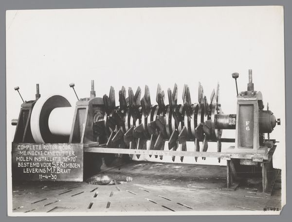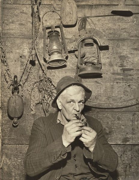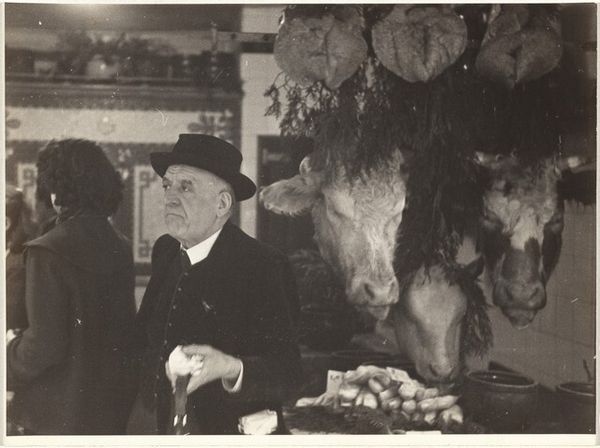 Editor: This black and white photograph, taken by Ken Whitmire Associates, captures a man in a cowboy hat posing with a sculpture of horses pulling logs. It gives me a feeling of nostalgia. What symbols jump out at you? Curator: The cowboy hat is a powerful marker of the American West, evoking notions of independence and the rugged individual. The logs signify labor and resource extraction. How do these visual elements contribute to our understanding of cultural memory? Editor: So, it's about the tension between man, nature, and work? Curator: Precisely. The sculpture itself, a miniature of a bygone era, acts as a cultural artifact reminding us of simpler times. Consider how the photographic medium further mediates our relationship with this historical narrative. Editor: It's like a memory within a memory. I hadn't considered that! Curator: Indeed, the visual symbols invite us to examine how we construct and maintain collective identities.