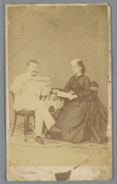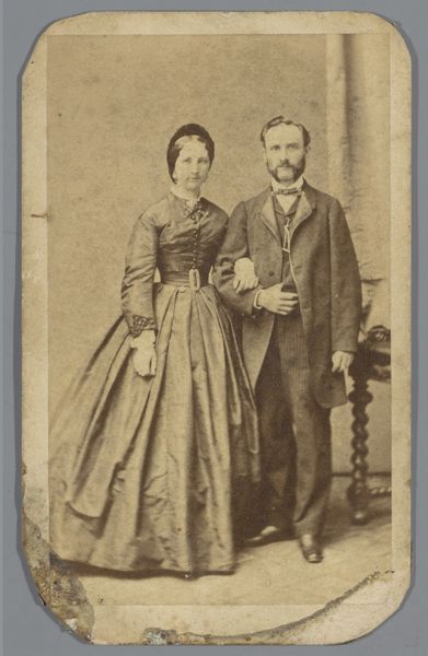 Curator: This silver print, a photomontage titled "The Queen and Prince Consort" was created in 1861 by John Jabez Edwin Mayall, and is now held in the collection of The Art Institute of Chicago. Editor: My first impression is of a stilted formality; it's interesting how the very constraints of early photography shape our perception of the subjects' personalities, freezing them in these artificial poses. Curator: Indeed, that is the crux of the early photographic portrait. The composition however shows that Victoria and Albert are at center, formally in their respective roles yet also positioned intimately, emphasizing her status through formal pose. Notice how Mayall employed photomontage, meticulously assembling multiple negatives to achieve the final image. What effects are created for you by the careful construction? Editor: The layered dress becomes quite interesting through Mayall’s work, with horizontal and vertical patterns offering another perspective and dynamic that the queen exudes, along with the contrast from Prince Albert's comparatively simpler form-fitting wear. I wonder about its social significance though—were these widely distributed and how did the public interpret these staged portrayals of their monarchs? What was the influence of the subjects and their cultural era, given royalty and society would often reflect imagery or ideas from paintings of those in charge? Curator: As portraiture, especially in photographs became widely popularized at that point, portraits like this would shape public perception by reinforcing royalty—often hung publicly and mass printed to sway the public opinion by being visible with certain stances and presentations. Think also of court painters, and now court photographers who reinforce royalty through carefully curated formal compositions. Editor: Looking at Victoria's sombre expression against the ornate gown is very engaging; also seeing how this type of portraiture began to shape political imagery through photographs over painted images throughout history. What the formal poses tell and how effective the messages would ultimately become, certainly makes me view this from the present. Curator: Mayall’s use of light and shadow adds another level of engagement as one is able to pick apart different areas of contrast between foreground, subject and background. I’ll be leaving with considering his technique more so, after reflecting over this photomontage today. Editor: Agreed, seeing all those many layers presented, the work provides an insight that history and photographic style really influence how we'll now view society then as they wished to present, as I too begin to think about photography even further.