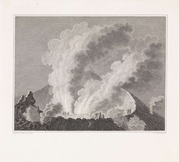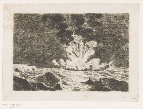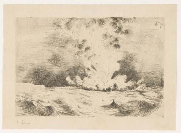 Curator: So, here we have "Doesburgermolen op de heide bij Ede," an etching by Wijnand Otto Jan Nieuwenkamp, created between 1902 and 1907. Editor: Gosh, what a little thundercloud of an artwork! All those swirling lines—it feels moody and windswept, doesn't it? Like a Brontë novel condensed onto a tiny copper plate. Curator: Exactly. Nieuwenkamp was known for his mastery of line and his ability to evoke atmosphere through these minimalist means. Look at the contrasts. The heavy, dark land against the light, almost ethereal sky. Editor: That lone figure—is it a person?—perched on the edge seems almost overwhelmed by the scene. Gives it a sense of scale and also a certain human vulnerability, you know? Curator: Indeed. And the use of light in this print is particularly striking. The lines radiating from the sky feel almost divine, casting a dramatic illumination on the landscape. There's also the way he layers the lines in the foreground, making the earth feel almost viscous, alive. Editor: Viscous is a great word. It feels both solid and on the verge of melting into the landscape. Like a dream about to dissipate. Did Nieuwenkamp do a lot of these, capturing moments? Curator: He travelled extensively and his etchings frequently captured the essence of a place—almost distilling it down to its purest visual form. These prints provided him with a sense of place, allowing him to connect with his subjects, in this case the rural Dutch landscape. Editor: I find the apparent simplicity deceptive. The longer you look, the more there is to see. And sense! The wind, the space. Curator: That is very astute, don't you think? And somehow, knowing it’s an etching—a technique that involves deliberate, careful strokes—makes it even more impressive. There’s something beautifully tactile about the whole thing. Editor: I’m left thinking how often simplicity allows us to access the vastness of our imaginations. Something to be said for limiting ourselves to expand. Curator: And this work invites us to slow down, to see beauty in what might at first seem austere. That for me, is where this landscape finds its strength.