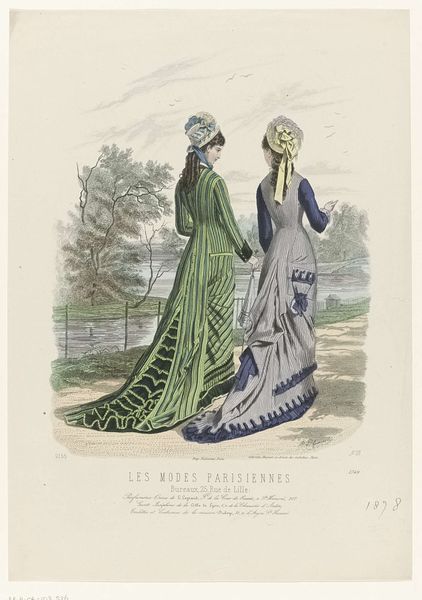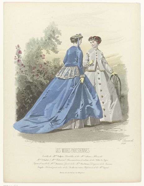 Curator: This intriguing image before us, entitled "An Explosion of Fashion Magazines," dates back to 1866 and presents a detailed watercolour illustration with elements of printmaking. It’s attributed to Carrache. Editor: It gives me such a peaceful, yet quietly absurd, feeling! Two elegant figures atop a... well, it looks like a mossy knoll. One’s gazing through what appears to be a spyglass! It is sort of humorous in tone to me. Curator: Yes, their positioning is rather striking. "Les Modes Parisiennes," as indicated at the bottom of the print, speaks volumes about the emerging fashion industry and the visual representation of women during the Second Empire. These images, circulating through magazines, did so much more than depict style. Editor: Fashion magazines – they’re like a looking glass into a particular moment. The details in their gowns! I am completely lost in the frills and details, this blue peaking from underneath this shapeless overcoat! What do you read into that? Curator: Well, blue gained significance historically with the Virgin Mary’s symbolic colour and began a shift toward high fashion. Remember, these magazines weren’t merely showcasing clothes; they were carefully constructing narratives around femininity, status, and aspiration, which the expanding middle classes absorbed quickly, imitating aristocracy. The woman with the spyglass could indicate foresight, looking towards that change that was stirring on the horizon. Editor: "Narratives" feels right. These aren’t portraits. They’re… stories waiting to happen! I find myself inventing backstories for these women – are they rivals? Friends sharing a secret? Escaping? Is the woman staring into a vast void symbolic of the age, a deep chasm in human feeling and culture that they desperately search for an answer in the dark? Maybe, it isn't all too serious, huh? Curator: I find myself questioning how these fashion plates shaped women's perceptions of themselves and each other. In the construction of an idealised Parisienne figure. They really underscore fashion’s cultural capital during this pivotal point in social change and expansion. Editor: It feels strange, seeing something so clearly designed to be desirable, and then filtering that intention through all of our modern understandings and complexities. You almost can't avoid reading your own experience into them and how women see themselves today! The ghost of that experience now imprinted into our interpretation and interaction of it, now... Well, It makes it somehow more poignant, more precious. Curator: Precisely. And considering the sociopolitical forces at play during the late 19th century, it reminds us that even seemingly frivolous images contain critical threads of identity, gender, and economic structures. Thank you for sharing your vision.