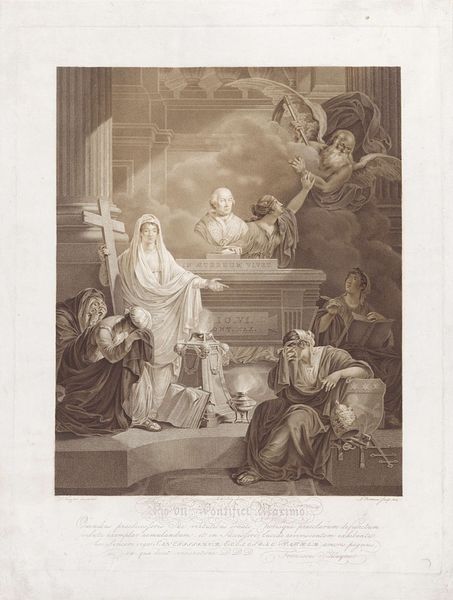 Editor: Here we have Francois de Poilly's "Visitatie," an engraving made sometime between 1632 and 1693. There's something very serene and orderly about the composition, despite the momentous occasion depicted. What stands out to you in terms of its historical and cultural significance? Curator: The piece, created during a period of significant religious and political upheaval, leverages a familiar biblical narrative—the Visitation—to subtly reinforce specific religious viewpoints. Considering the proliferation of prints at the time, it's important to examine how readily such imagery was circulated and how it participated in broader societal dialogues around faith, power, and morality. Look at the central positioning and illuminated presentation of Mary; what does that say to you? Editor: It seems to emphasize her importance, almost as if she's a figure of authority despite the humbleness of the scene. Is that reading into it too much? Curator: Not at all! Baroque art frequently navigates a tension between conveying religious narratives and asserting the power and influence of the Church. Ask yourself how this image might function within the context of the Counter-Reformation or even courtly power dynamics, considering Poilly's position. The printing press made such controlled messaging all the more insidious and powerful. Editor: So, it’s not just a simple depiction of a biblical event, but a carefully constructed visual argument with social and political implications? Curator: Precisely. The engraving's style, the choice of subject, and its dissemination – these are all elements that contribute to the artwork's cultural and historical meaning. Consider too the engraving's likely audience – the consumers and how their position informs the art. Editor: This makes me rethink how I approach art, considering its role as an active participant in shaping societal norms. I had never really appreciated how a print could carry such weight! Curator: It's a constant interplay between artistry and audience, isn't it?