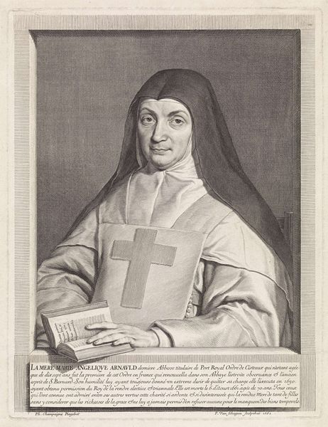 Editor: This is a print from the late 1670s, titled "Portret van Clara Maria van de passie," created by Albertus Clouwet. It's an engraving depicting a nun, framed by an oval wreath. The level of detail, achieved just through lines, is remarkable! What symbols or meanings do you see embedded within this portrait? Curator: Immediately, the image evokes ideas of piety and the structured life. Consider the very deliberate choices in composition – the oval wreath, a classic symbol of eternity and completion, framing her. The lettering below provides biographical information that invites further reflection, wouldn’t you agree? Editor: Definitely. It seems almost like a biographical monument. Does the choice of flowers have a significance? Curator: Likely. Floral symbolism was incredibly important. We’d have to examine which flower it depicts. Further exploration into Clara Maria’s life and the Carmelite order, its cultural history, the visual symbolism would likely reveal why Clouwet framed her with a particular flower. Are you sensing connections between her, the image, and the viewer across time? Editor: That's a great point. It does seem designed to create a connection between Clara Maria's piety, her earthly presence represented in the portrait, and the viewer's own contemplation. Curator: Precisely! The print functions as a tool for meditation, an aide-memoire as it were, of the enduring ideals that Clara Maria represented to her community, her faith made visual. This creates a potent cultural memory. Editor: So, beyond just a portrait, it's almost a reliquary in print form? Curator: Yes! By using established iconographic traditions, the artist sought to embed her within a system of shared meaning, one that hopefully transcended her death and spoke to the continuity of belief. It gives one pause. Editor: I agree, considering it through the lens of cultural memory, I can now recognize layers of intended significance I hadn’t seen at first. Thank you!