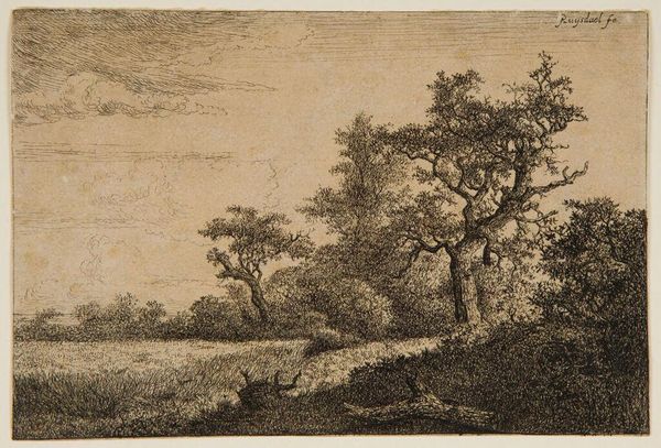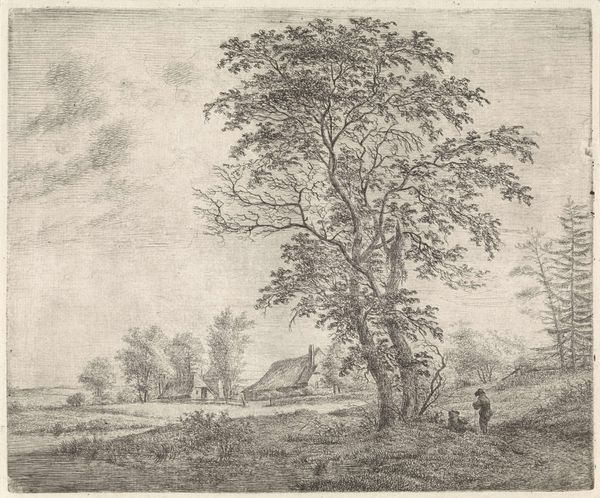 This etching, Wandelaar in de duinen buiten Haarlem, was created by Anthonie van den Bos in the late 18th or early 19th century. Observe the solitary wanderer in the dunes, a figure dwarfed by the natural landscape. The crooked tree, reaching across the path, is reminiscent of the Tree of Knowledge in biblical art, symbolizing a crossroads or turning point. Consider its echoes through time. In medieval allegories, trees often signify life, growth, and moral choices. The gnarled form here suggests resilience and adaptation, mirroring the human condition. This motif recurs in various forms across cultures, from ancient myths to modern literature, each time imbued with new layers of meaning. Perhaps this image triggers a sense of introspection. Like the wanderer, we are all traversing our own paths, facing our own internal landscapes. These symbols resonate with our collective memory, touching on deep-seated fears and aspirations. In the cyclical dance of history, they reappear, transformed yet familiar, inviting us to contemplate our place in the grand narrative of existence.