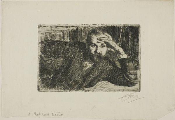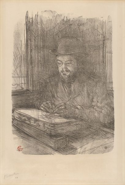 Curator: This is Jan Toorop's "Portrait of Engelbert van Bevervoorde, Bailiff of Muiden," a charcoal drawing created in 1886. It currently resides here at the Rijksmuseum. Editor: There’s a profound sense of melancholy about it, isn't there? He’s caught in a moment of private reflection, head bowed over what appears to be a book. The darkness really draws me in. Curator: Agreed. The materials are quite raw, especially the charcoal itself, allowing the viewer to sense Toorop's hand at work. Look at the smudging and layering to achieve depth. The rough strokes of charcoal give life to van Bevervoorde’s likeness while keeping the whole piece very subdued. Editor: Absolutely, and considering the context, it reads almost like a critique of power, not just a simple portrait. Here's this official, a man embodying Dutch authority in Muiden, but Toorop captures him vulnerable, immersed in something other than his duties. What is he reading, and what implications do those texts hold for a figure of his position? Curator: That contrast between public duty and private introspection makes this work interesting. Perhaps it touches on ideas of bureaucratic labor and the emotional toll that holding power takes. Editor: Indeed, or even broader social commentary on late 19th century society as well. I can almost hear him sigh! Curator: I hadn’t thought of it that way, but I agree with its social impact. Thinking about it more, the texture emphasizes the physicality of his coat and the paper in his hands. Toorop seems focused on revealing the tangible and lived reality. Editor: I think placing it within the framework of evolving political thoughts emphasizes this work's ability to be very compelling in its nuanced representation of societal norms and personal identity during the era it depicts. Curator: Yes, I like that connection. It gives the drawing a sharper, more critical edge. Editor: It makes me wonder about the commission itself. What was van Bevervoorde hoping to project, and how much did Toorop subvert that? Curator: Precisely. Thank you for unveiling all of this about "Portrait of Engelbert van Bevervoorde" using sociopolitical awareness. Editor: Of course. I appreciate your insight regarding its historical importance!