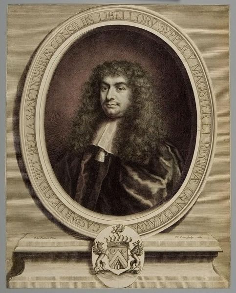 Curator: Looking at this print, "Olivarius Le Fevre d'Ormesson" by Antoine Masson, I'm immediately drawn to its tactile quality. The density of the lines creates a visual richness, almost like velvet. Editor: It's certainly a striking image. Masson produced this portrait, now held at the Harvard Art Museums, in the late 17th century. Ormesson held positions in Louis XIV's court; this image broadcasts his status and role within the French government. Curator: Precisely. The textures of the hair and fabric are rendered with such care; it speaks to the skilled labor involved in printmaking at that time. Consider the paper itself—likely handmade, a valuable commodity. Editor: And how prints like this circulated images and ideas. It's not just a depiction of an individual but also a statement about power, disseminated through a reproducible medium. Curator: The material process underlines the social context. The portrait served as a form of early public relations, crafting an image for a specific audience. Editor: Indeed, it shows how art actively participated in constructing and maintaining social hierarchies. It offers a fascinating glimpse into 17th-century politics. Curator: Studying the artistic process alongside history really shows how it served purposes beyond simple image creation. Editor: I agree. I am left wondering about other politicians' portraits, and the visual language of power they shared.