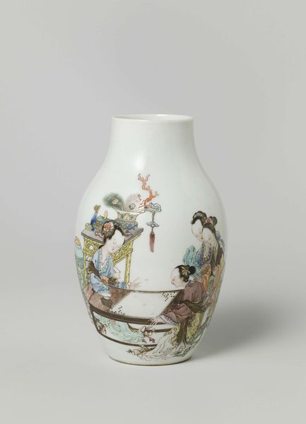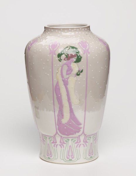 Curator: The Rijksmuseum holds this intriguing vase, crafted circa 1740 to 1760 by an anonymous artist. The vase is earthenware with, ceramic, stoneware, watercolor illustration, and decorative elements, showcasing Rococo design influences, including portraiture, genre, painting, and figuration elements. Editor: Well, right away I’m drawn to the figure depicted within the central framed scene. Her gaze meets ours with a kind of gentle inquiry, set against those dreamy pastoral colors. Curator: Yes, and it’s precisely that idyllic scene contrasted with the ornate, almost overwrought gilding, that speaks volumes about the society for which this object was made. Think about the era—the Rococo was deeply entwined with aristocratic indulgence, a fantasy of rural life even as many people toiled. This vase likely served a decorative purpose in a wealthy home, a daily reminder of curated beauty. Editor: I see your point. Still, the artist clearly put so much thought into balancing detail with open space, that frame provides a lovely contained composition that focuses my eyes in specific ways. Look at how the colors bleed softly into one another and into the frame—almost like a memory contained by metal. The slight tilt of her head, framed by that charmingly wide hat, it’s a superb miniature study. Curator: And miniature it is, designed for display, meant to communicate a certain cultivated taste. Consider also the subtle power dynamics: Who commissioned it, who made it, who likely purchased and placed it? That single object has such complex ties that reveal important insights. Editor: Perhaps you are right, still, when viewing art from this remove I think focusing on the material execution lets us appreciate details of human intention regardless of the wider political context. Curator: A fair point. Even when removed from immediate context, artistic skill can cut through the barriers and echo still through centuries. Editor: Yes, I will remember the scene for a while as that glimpse can reveal even our personal meanings through formal relationships of figures, colors and shapes.