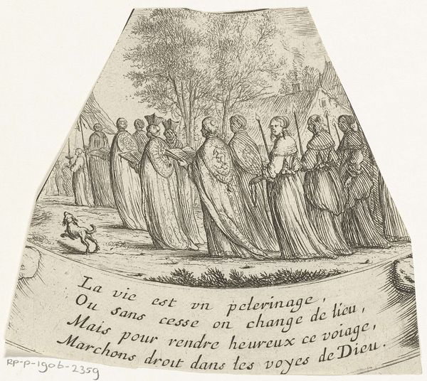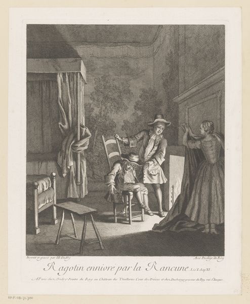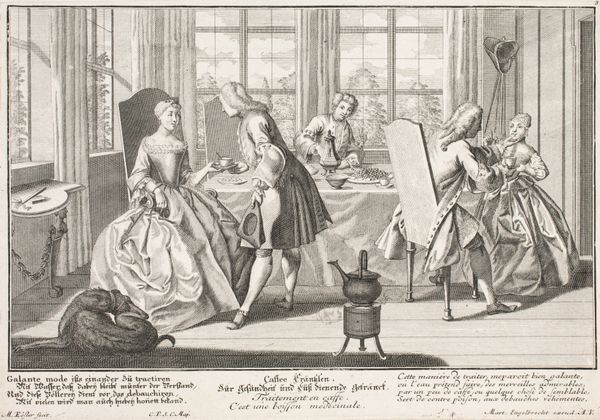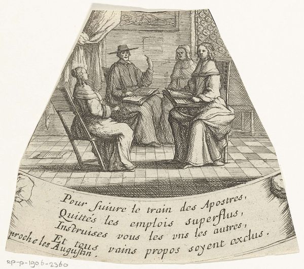 Editor: This is "Zieken bezoeken" or "Visiting the Sick" by Albert Flamen, an etching from around the mid-17th century. It looks like a scene inside a hospital or perhaps a charitable institution. The figures seem somber but industrious. How do you interpret this work within its historical context? Curator: Precisely. Flamen presents us with more than just a scene; he offers a commentary on societal values. The 17th century was a period marked by significant social stratification, and the rise of institutions aimed at caring for the less fortunate played a crucial role in shaping the public perception of charity and social responsibility. The Baroque style here, with its detailed rendering of the interior and figures, underscores the gravity of the subject matter. Note the architectural space—does it evoke a sense of communal care or of institutional control, do you think? Editor: I see what you mean. It’s interesting how the architectural detail and the cross evoke religion and thus the church, yet it feels removed because of the emerging institution…almost like two types of “care”. Was this intended to celebrate altruism, or perhaps subtly critique the conditions that necessitated such places? Curator: It’s a valid question. Etchings like these often served multiple purposes. On one hand, they showcased acts of benevolence, reinforcing social norms and promoting charitable giving. On the other hand, by depicting scenes of illness and poverty, they subtly highlighted the existing social inequalities, raising awareness, and, perhaps, even prompting some level of social reform. We might even consider who the audience was for such an image. Editor: That makes me think more about the rise of institutions versus smaller charitable work. I never considered that dichotomy and how art participates. Curator: It’s a fascinating field! Next time, consider how patronage might influence such imagery.