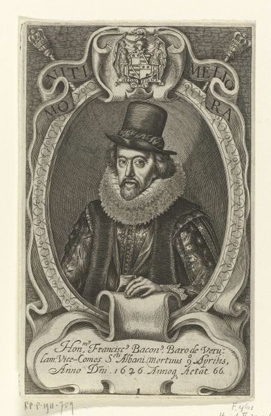 This is Simon van de Passe's "Portret van James I", an engraving at the Rijksmuseum. Notice how the portrait is framed within an oval, immediately setting up a contained, formal space. The subject, James I, is rendered with intricate lines that define not just his features but also the textures of his clothing. The ruff, the fur, and the ornate chain, each meticulously detailed, speak to a society obsessed with status and representation. Van de Passe’s engraving technique uses hatching and cross-hatching to create tonal variations, giving depth and volume to the figure within the flat plane. Consider the semiotic weight of these choices. The precision in depicting the material wealth surrounding James I doesn’t merely represent the king; it constructs a visual language of power. The artist uses line and form to convey a sense of immutable authority. This portrait thus functions as a carefully constructed symbol, designed to communicate specific ideas about sovereignty and lineage.