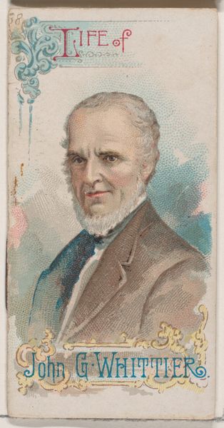 Editor: This small lithograph, "Colonel Richard March Hoe, printer's sample for the World's Inventors souvenir album," made by Allen & Ginter in 1888, feels almost like a precursor to modern trading cards. It has this dignified portrait of a man in profile... I’m really curious – what jumps out at you when you look at this piece? Curator: Oh, that little glimpse into the past always makes my mind wander! Imagine finding this tucked inside a pack of cigarettes! What I find fascinating is how it straddles the line between advertisement and, well, a miniature shrine to innovation. Hoe wasn’t just anyone; he revolutionized printing! This humble card becomes a portal. Don’t you find it compelling how a everyday habit like smoking becomes intertwined with celebrating intellectual achievement? It makes me think, what would a "World's Inventors" series look like if made today? Editor: That's a good point. The connection to cigarette advertising is a bit unsettling, given what we know now, but it also reveals how popular culture elevated inventors. Are there any particular elements of the portrait itself that you find noteworthy? Curator: Absolutely! The detail crammed into such a tiny space is astounding. And notice how he’s not looking at us? The gaze is directed, fixed on the future, maybe visualizing his next invention. Also, the swirling textures of his hair and beard contrast nicely with the angular precision of his suit. Tell me, does it bring to mind any other portrait styles of the 19th Century? Editor: Now that you mention it, it’s kind of a commercial take on academic portraits that were popular then. Thanks, I am actually rethinking my initial response. It has deeper cultural meaning. Curator: Exactly. Each viewing unlocks further hidden meaning.