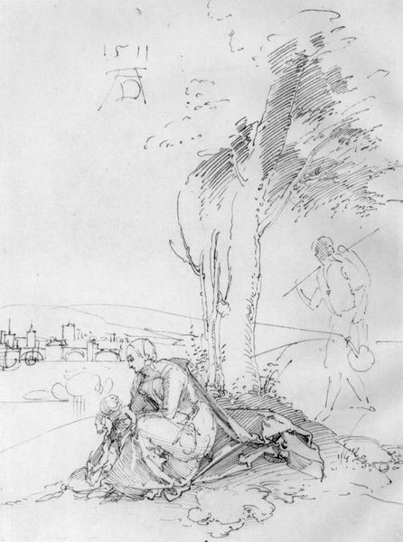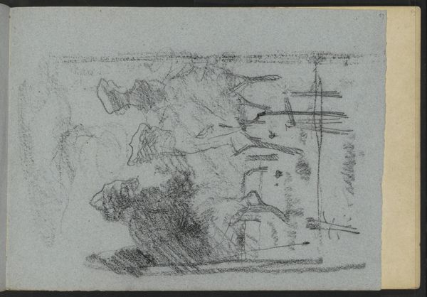 Curator: Daniel Huntington's Study of Lake and Shore, Mohonk, from 1871. A sketch rendered in pen and ink. What are your immediate thoughts? Editor: Stark and serene, with the subdued quiet you often find in nature drawings. There's a rawness to the lines—it's a clear, quick notation of form. Curator: Indeed. Note the confident economy of line, which deftly captures the lake’s stillness and the craggy textures of the shore. See how the skeletal trees in the foreground serve to frame the composition, directing the eye toward the distant mountains? Editor: Huntington must have swiftly laid the drawing out, likely capturing that time and specific location in situ. And let’s acknowledge the obvious constraint: working in ink limits the possibilities to alteration and immediate adjustments. Do we know about the quality of the ink and paper? Was this standard supply or higher-end material for display? Curator: These are excellent material considerations. Huntington's quick and assured strokes illustrate a mastery achieved through consistent practice. It’s about more than just depiction. Huntington uses line not only to delineate form but also to suggest atmospheric depth and a tranquil mood. The drawing displays a kind of refined formal control and illustrates his conceptual priorities around line and mark-making. Editor: The final rendering, I agree, makes it an evocative artifact. Given it's one page within a sketchbook, there would presumably have been other images from that visit at Mohonk and the surrounding landscape. And those decisions, for us, have very tangible ramifications concerning mark-making, image conception, material choices and access, labor... all crucial aspects of artistic creation. Curator: Agreed, viewing Huntington’s study, it becomes clear that this piece offers not only a landscape but a lens through which we can examine Romanticism’s enduring fascination with nature’s sublimity. Editor: An exercise in directness and documentation! This small page provides plenty of opportunities for further readings when we really dig into the materiality of the production.