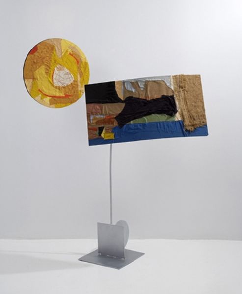 Jessica Stockholder made "#291" by assembling domestic items to create a sculpture or assemblage. What strikes me first is the way color organizes the composition, from the mellow mustard and cobalt hues of the cushion, through the boxy plastic frames, down to the matching orange of the small hand-held plungers. I find myself drawn to the stacked arrangement, the way Stockholder has played with our expectations of form and function. The cushion, casually hung, supports the plastic frames in a play on ideas of support. The eye travels from the circular mirror to the cascade of orange plungers, a visual echo that unites the piece. It makes me think of Kurt Schwitters, who elevated the everyday detritus to the status of art. But unlike Schwitters’ collages, Stockholder’s sculpture bursts into our space, challenging us to reconsider the world around us.