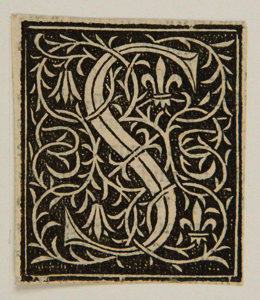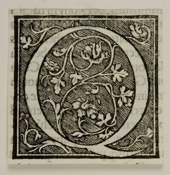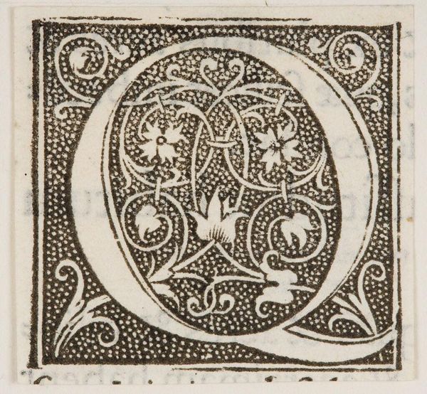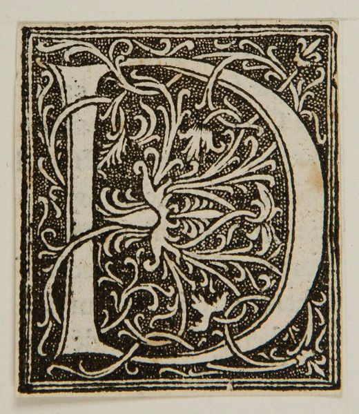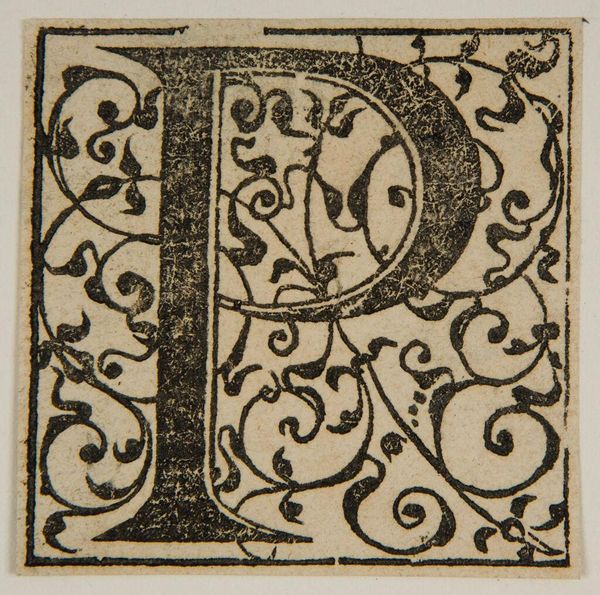 Editor: Here we have "Letter P" by an anonymous artist, and I’m struck by the contrast between the stark white letter and the densely patterned background. What visual elements stand out to you? Curator: Observe how the artist has utilized positive and negative space. The white 'P' establishes a clear form, yet the surrounding botanical motifs, rendered in black, vie for visual dominance. Do you see how the interplay of these elements creates tension? Editor: I do. It’s like the letter is fighting to emerge from the ornate design. Does the texture play a role? Curator: Indeed. The stippled background gives a tactile quality, enriching the overall composition. The linear contours of the letterform stand in stark contrast. Considering all, what have we learned? Editor: I see how the artist created visual tension and balance using form, texture, and the push and pull between positive and negative space. Thank you! Curator: A stimulating inquiry, focusing on the form itself.