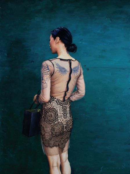 Editor: Here we have Daniel Greene's "Danielle - Canal St.", a painting – the date isn’t listed. She stands before the vibrant red tiles of the Canal Street subway station. The figure, juxtaposed against the rigid geometry, has a serene, almost classical feel. What do you make of it? Curator: Considering the means of production, this work embodies a fascinating tension. Greene's skillful application of paint, to mimic both the human figure and the utilitarian tiles of the subway, raises questions about value and labor. Is the artist elevating the everyday, the "low," through traditional portraiture, typically a form of "high art"? Editor: So you’re saying it blurs lines of craftsmanship versus art? How? Curator: Exactly. Notice the repetitive, manufactured nature of the tiles versus the unique labor involved in portraying Danielle. The painting's materiality invites us to think about the socio-economic contexts intertwined here. The subway is a space of mass transit, built by laborers and utilized by a diverse population, compared to the typical clientele of a portraitist. What statement is Greene making by setting this figure in this location? Editor: Perhaps it's about bringing art to the people, making it accessible, since so many use the subway. The red tile seems quite vibrant given your comment. Curator: Indeed. Its uniformity reflects mass production while its presence as the ground for the figure invites commentary on class and accessibility within art’s production. Editor: I never considered those dualities and material contexts at play. Thanks for illuminating the subject matter with historical awareness and craftsmanship. Curator: It’s in understanding the work put in, that the work reveals itself.