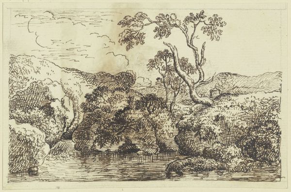 Franz Kobell’s "Landscape with River, Distant Hills, and Figures Fishing in Foreground," captures a serene pastoral scene through brown ink on paper. Dominating the composition are verdant trees framing distant hills—a romantic vision echoing the era’s preoccupation with untamed nature. The fishermen in the foreground invoke a connection to classical antiquity, echoing scenes of Arcadia, representing an idealized simplicity. This idyllic motif finds resonance across centuries, reappearing in various forms, from classical poetry to Renaissance paintings. The tree, deeply rooted yet reaching skyward, is an archetype of stability and growth, symbolizing the human condition—a connection between earth and the heavens. The depiction of nature here isn't merely aesthetic; it’s a reflection of the subconscious desire for harmony and peace. Note how these symbols have evolved. What once symbolized pagan reverence now embodies a more secular, humanistic yearning. The emotional power of this image lies in its ability to tap into our collective memories, triggering a primordial longing for a world in balance.