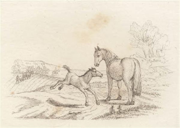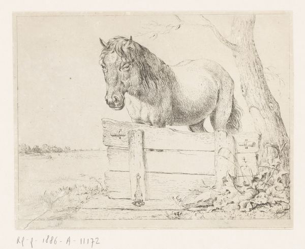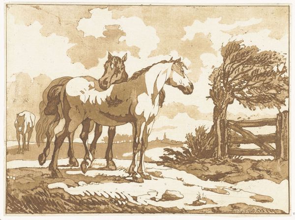 Editor: Here we have "Paarden," a pen and ink drawing attributed to Anthonie van den Bos, created sometime between 1778 and 1838. It strikes me as such a peaceful, pastoral scene. What catches your eye, what can you tell us about this work? Curator: It’s interesting you see "peaceful." I see the residue of power structures. Landscape art during this period was intrinsically tied to land ownership and societal control. Consider the relationship between the artist and their potential patrons. Who commissioned or purchased such drawings? The landed gentry, perhaps, projecting their dominion. Editor: That's a perspective I hadn't considered! So, the image of horses grazing peacefully is almost...propaganda? Curator: Not necessarily explicit propaganda, but it certainly participates in the visual construction of a specific social order. Think about the rise of agrarian capitalism at the time. Drawings like this idealize rural life, masking the harsh realities of labor and inequality that fuelled it. What do you notice about the composition itself? Editor: Well, the horses seem very deliberately placed. The strong one in the front. Is there maybe a class implication even in their placement, framing of power within their small herd? Curator: Exactly! And who decides which horse is 'strong'? The artist, of course, reflecting contemporary societal values. The fence in the background is also intriguing – it denotes ownership and enclosure, visual symbols deeply ingrained in the period’s understanding of land. It really shifts our perception. Editor: I’m definitely seeing this with new eyes. The image is now less a simple pastoral scene and more of a loaded document reflecting societal structures. Thanks so much! Curator: My pleasure. It’s always rewarding to unearth these layers within seemingly straightforward images. This work reminds us that art is never created in a vacuum.