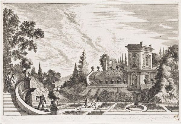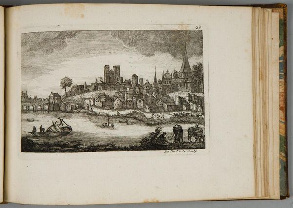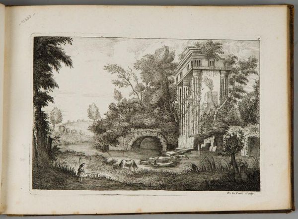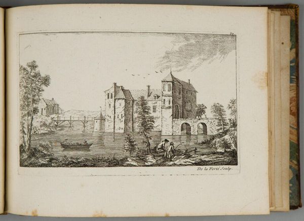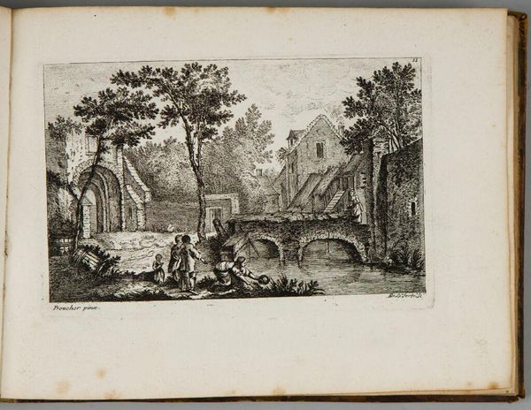 Editor: This is Denis-Pierre-Jean Papillon de la Ferté's "Village by the Bridge," an etching. The delicate lines create such an interesting texture. What strikes you about the composition? Curator: Note the contrasting textures achieved through varied hatching. Consider how the artist renders depth through line weight and density. The interplay between the solid structures and the airy sky creates a compelling formal tension. Editor: So, the artist is using line itself to create both form and space? Curator: Precisely. The formal elements become the content itself, inviting us to contemplate the pure visuality of the scene.