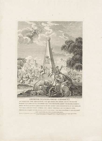 Johannes Christiaan Bendorp created this print titled, "Statue of Liberty Decorated and Protected by the French and Batavians", in 1795. The monochrome image presents a tableau of figures set against a rugged, rocky landscape, evoking both a classical and contemporary feel. The print is dominated by the allegorical figure of Liberty, centrally positioned and highlighted by the lighter tones around her. The figures surrounding Liberty show a clear division between the orderly ranks of soldiers on the left and the more active, engaging figures on the right, creating a dynamic contrast. The discarded weapons and musical instruments at the bottom of the scene introduce a sense of transformation, hinting at a shift from conflict to harmony. Bendorp uses the structure of the composition to underline the theme of liberation and the establishment of a new social order. This artwork invites us to consider how visual representation can play a role in shaping and celebrating political ideologies.