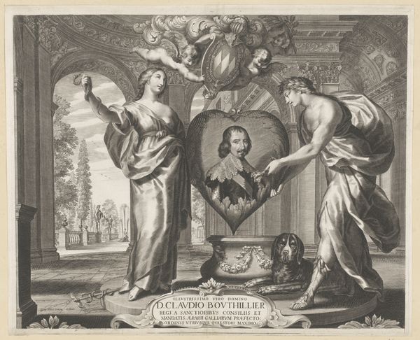 Curator: This is a delightful little engraving by Jan Goeree, dating back to 1733, titled "Vignet met een embleem van een boom," here at the Rijksmuseum. Editor: It strikes me as rather intricate. The density of lines is incredible, particularly around the central image of the tree and figures. It's quite tactile for a print; I can almost feel the pressure of the burin on the copper plate. Curator: Goeree was a master of allegory. Look at the figure on the left, adorned with a laurel wreath. That’s undoubtedly an allegorical representation of virtue, offering laurel and presumably victory. Editor: And juxtaposed on the right we see the classical trope of achievement or merit, almost reaching for what Virtue provides...it's carefully staged to evoke the connection between these ideas, with what seems like symbolic currency? All perched atop that central emblem: “Virtutis Gloria Merces"—glory is the reward of virtue. It's practically a brand identity, or at least, a visual motto. Curator: Exactly. And what’s fascinating is considering who would have commissioned such a piece. Emblems were powerful tools for self-promotion, often employed by intellectuals, merchants, or even political figures, to project an image of moral standing and worldly success. Think of the rising merchant class, the powerful guilds, all seeking legitimacy through cultural association. Editor: It also prompts questions about the engraving process itself. The labor invested here, the artisan skilled enough to produce such detail—how was this labor compensated? How did it situate Goeree within the art market of his time? Were these mass-produced or individually commissioned? It begs us to consider production and distribution, where this engraving was printed, sold, and collected. Curator: Yes, and consider the wider impact: Prints democratized art in a way that paintings couldn't. This engraving would have been disseminated widely, spreading these allegorical messages and ideals throughout Dutch society. The print functioned as a propaganda of moral and ethical codes, accessible to the educated class. Editor: Such detailed engraving offers a tangible, accessible reflection on how images shaped the very idea of “virtue" at this period. Curator: A fine emblem indeed, reflecting the power of virtue as promoted by Goeree’s capable hand. Editor: It pushes us to examine the material and social dimensions intertwined with artistic expression.