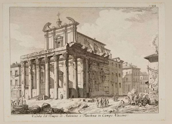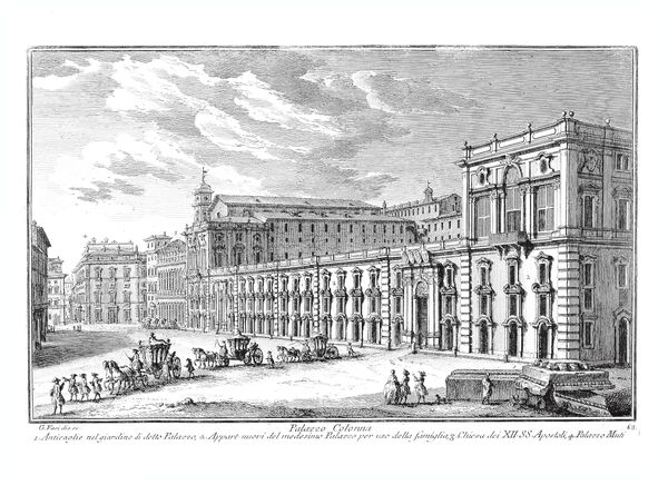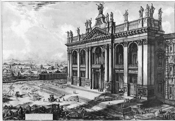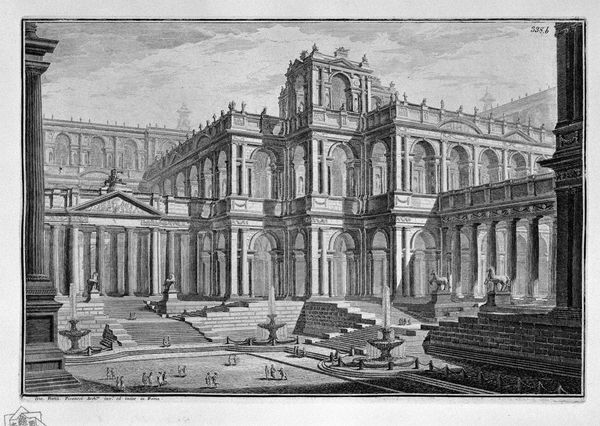 Giovanni Battista Piranesi created this etching of a royal courtyard, dominated by an imposing loggia, sometime in the 18th century. The stark contrasts and precise lines evoke a sense of grandeur and architectural precision. Piranesi masterfully uses perspective to draw the eye deep into the courtyard. The colonnades on either side create a rhythmic pattern, emphasizing the depth and scale of the space. This play of light and shadow not only defines the architectural forms but also imbues the scene with a theatrical quality, reminiscent of stage design. The human figures scattered throughout serve as scale markers, underscoring the monumental nature of the setting. The loggia acts as a focal point, framing distant views that hint at a world beyond. Piranesi’s work often engages with the themes of power and the sublime, inviting viewers to contemplate the relationship between humanity and its built environment. This artwork challenges fixed notions of space and perception through the interplay of scale, depth, and perspective.