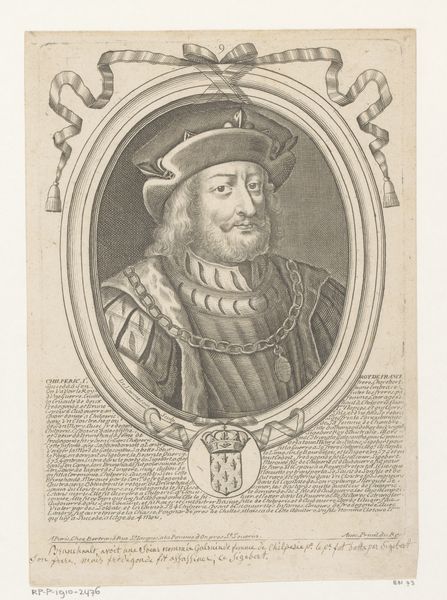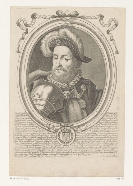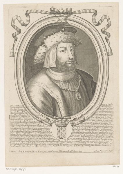 Curator: This engraving, "Portret van Childebert II" by Nicolas de Larmessin I, produced sometime between 1647 and 1678, presents an intriguing case study in the consumption of history. The stark lines and detailed rendering immediately strike me as a blend of artistry and industry. Editor: Yes, the sheer amount of tiny, careful marks made to create this portrait is striking. What do you find most compelling about this piece? Curator: For me, it's the layering of processes and contexts. Consider the material reality: We have an engraving, a print intended for relatively wide distribution, depicting a historical figure from centuries before. It wasn’t necessarily about capturing the likeness of this leader; it's about consuming a manufactured image and reinforcing a lineage of power through the medium itself. Editor: So, it's not about the artistic skill, but about how the work's material form circulates ideas. Curator: Exactly! Look at the choice of engraving—a readily reproducible format, allowing for dissemination and popular consumption of imagery relating to monarchy and the elite. And, furthermore, consider the labor involved. Countless hours were poured into producing this matrix for endless copies. Editor: Does the line style, specifically, also tell a story of labor and accessibility, considering its reproducibility? Curator: Precisely! This line style, characteristic of academic art, was intentionally chosen and reflects a codified artistic process aimed at producing aesthetically consistent results efficiently. This ensured a level of standardization and ease of reproduction – essentially aligning the image with mass production capabilities available then. What implications do you think this may hold for understanding concepts such as "high art" at that time? Editor: So, while we might see a king's portrait, you see labor and an emerging form of visual distribution shaping society's ideas about leadership. Curator: Indeed! This changes the perspective to the social consumption of artmaking, shifting how power is produced and observed. Editor: Thanks! Now I see this print with new eyes. I appreciate this materialist lens for interpreting art beyond aesthetics.