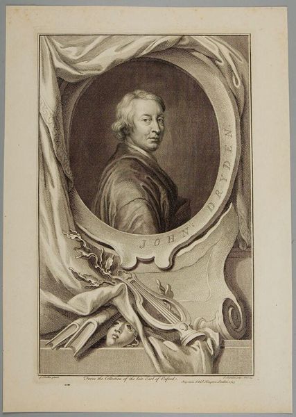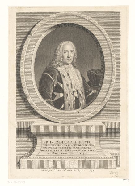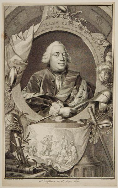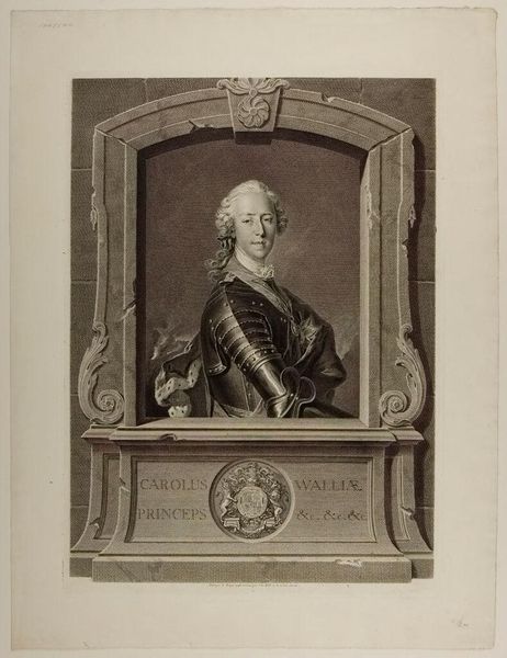 Editor: Georg Friedrich Schmidt’s portrait of Michel de Woronzow has such a formal quality. The subject is framed by this architectural stone structure. What can you tell me about the piece? Curator: Consider the role of portraiture in cementing power structures. Woronzow's gaze and opulent dress assert dominance. How does Schmidt's choice of engraving as a medium contribute to the distribution and reinforcement of this image of authority? Editor: That's fascinating. I hadn’t considered the impact of the medium itself. Curator: It's key. The lines are crisp. Does this reinforce his image as a powerful figure? Also, consider what this portrait omits – whose stories are silenced by this singular focus on elite male power? Editor: I see, it invites us to think about representation and its sociopolitical effects. Thank you.