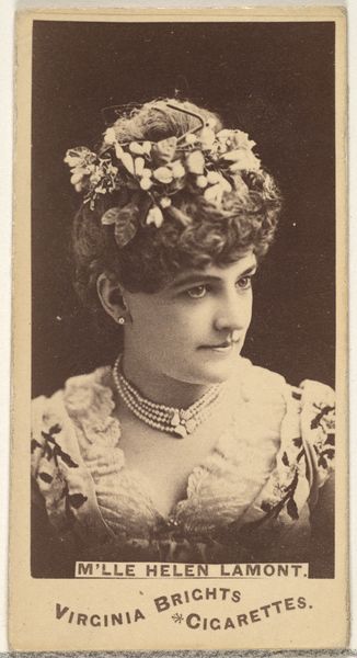 Editor: This is "Miss Linthicum, from the Actors and Actresses series" created between 1885 and 1891 by Allen & Ginter. It appears to be a photographic print. There's something very formal and almost dreamy about it. What elements stand out to you? Curator: The subject is framed with a nuanced understanding of tonal value. Observe how the highlights on Miss Linthicum's face and pearl necklace subtly contrast with the dark, flat background. The photographer masterfully uses light to direct the viewer's eye. Consider the balance between texture and form. Editor: I hadn't considered that. So you are focused less on the subject, and more on how it looks, as an image? Curator: Precisely. It is in the deliberate composition—the soft gradations of tone, the geometric framework, the lines of her garments that define the structure. The work reveals its depth. How does the framing interplay with your perception of the sitter? Editor: I guess it does give her a classic elegance. The almost sepia tones and limited range contribute a lot. Are these features due to the printing techniques used, or deliberate choices, do you think? Curator: One cannot entirely separate the constraints of photographic technology of the late 19th century from artistic intent. However, the success lies in exploiting these constraints, such that limitations became strengths in this image. What do you make of the textures evident in the image? Editor: It feels as if the rough paper and the shallow depth give it a tactile quality. I had previously thought it to be a drawing. It certainly prompts me to focus on materiality more! Curator: Yes, examining the artwork from this viewpoint allows the convergence of artistic intention and technical process to be visible, inviting an aesthetic reading removed from narrative. Editor: Thanks; I really learned a lot about analyzing art with just the visuals. Curator: My pleasure, looking through form over content allows for more interesting perspectives.