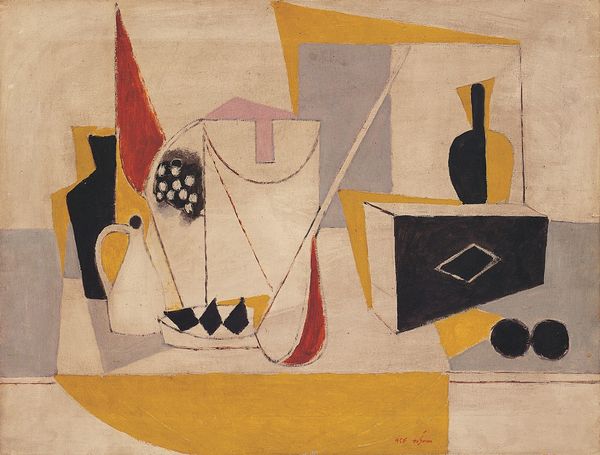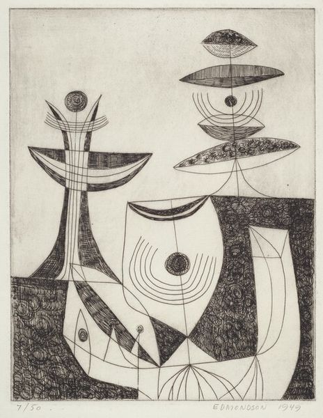 Editor: This is "Puppets," a 1947 ink and watercolor work by William Baziotes. It strikes me as so whimsical, almost playful with its linear forms. How do you approach interpreting a piece like this? Curator: The title, "Puppets," offers an initial frame. Yet, the power here lies in the interplay of forms, line, and color. Notice the predominance of geometric shapes and how the delicate watercolor wash barely contains the firm black lines, allowing for tension. What do you make of the composition itself? Editor: The forms definitely have this quality of feeling contained yet escaping. They’re distinct, but their placement creates a single plane and almost masks what the actual subjects are. Curator: Precisely. Abstraction encourages us to focus on form, color, and line. Baziotes avoids direct representation, prioritizing the formal elements. Note the subtle shifts in line weight and the recurring motif of circles. The composition doesn't create traditional depth, fostering a flatter space for our eyes to visually decode it. Editor: It’s almost like the essence of the idea of a puppet is conveyed through these elements instead of a clear figure. Curator: Exactly. By disrupting conventional representation, Baziotes forces a visual reading of geometric versus organic form and transparency to reveal form and void, shape and tension. Editor: That reframes the experience. Initially, it was simply charming, now, observing the use of basic shape language really makes you reconsider the purpose of form, and if recognizable content is necessary. Curator: It shows how an abstract drawing prompts a heightened awareness of its own structural elements, pushing us to look at the world with new eyes.