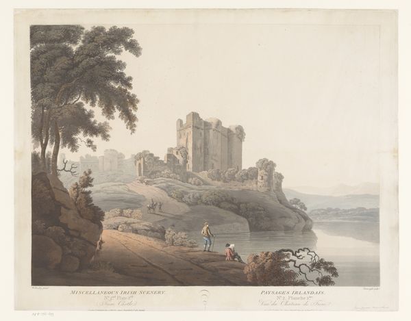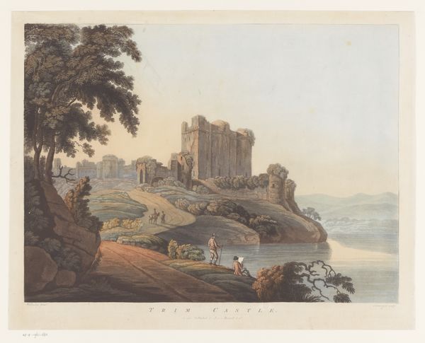 John Hassell created this aquatint of Berry Pomeroy Castle using watercolor. Its most striking feature is the composition, organized around a series of receding planes that lead the eye towards the castle ruins. The use of aquatint allows for subtle gradations of tone, creating a sense of depth and atmosphere, while the watercolor adds a delicate, almost ethereal quality. Hassell employs a muted palette, dominated by greens, browns, and blues, which evokes a sense of melancholy. The ruined castle, rendered in soft hues, becomes a symbol of time’s passage. The figures in the foreground, diminutive in scale, emphasize the grandeur of the landscape and the imposing presence of the ruins. This contrast between the human figure and the architectural decay invites us to reflect on our place within the vastness of history and the natural world. The formal elements of line, color, and composition work together to evoke a sense of nostalgia and contemplation, positioning the artwork within broader themes of Romanticism and the sublime.