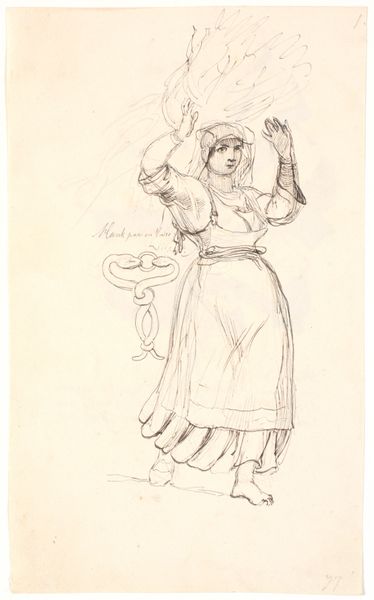 Editor: This is Otto Scholderer’s pencil drawing on paper, "Stehendes Mädchen mit Stock," or "Standing Girl with Stick," housed at the Städel Museum. I’m struck by the hand, sketched separately above the girl, almost like a hovering spirit. What do you see in this piece? Curator: I’m drawn to the stick itself. It acts as a sort of axis, doesn't it? Consider the symbolism of verticality. A stick, or staff, can represent authority, guidance, even pilgrimage. Is the girl, on the cusp of adulthood, clinging to a symbol of childhood protection or reaching for something more? What emotional weight does such an emblem carry? Editor: I hadn't considered that. I focused more on her dress and posture, which felt like typical genre painting. Does that hand have any specific resonance? It feels incomplete, floating there. Curator: Precisely! Consider hands in art history: creation, benediction, action. Here, the hand, separated and incomplete, could represent a fractured aspect of herself, a desire for intervention, perhaps even artistic creation. Notice the subtle pressure the girl applies to the stick. It mirrors the hand; both incomplete, in different ways, but tethered. Does the girl actively will it to move, to act on her desires, hopes and aspirations? Editor: That makes the drawing much more psychologically complex. The seemingly simple image of a girl with a stick now feels loaded with potential narratives about growing up. Curator: Indeed. Scholderer captures that liminal space, that in-betweenness through layered, archetypal imagery. There's a story in every line, isn't there? A story of cultural memory. Editor: Definitely food for thought! Thanks for helping me see this in a new light. Curator: My pleasure. I'm walking away feeling the image resonate much deeper with what I do today.