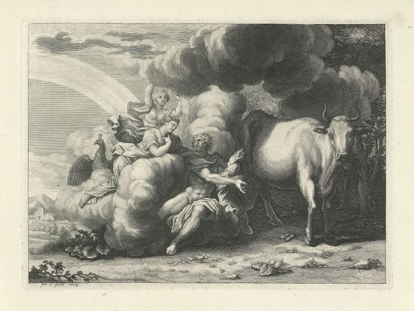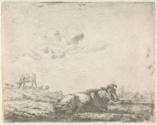 Johannes Janson created this etching, "Two Cows in a Meadow," in the 18th century. Janson lived during a time of significant social stratification, and his artistic choices reflect both the values and the realities of his world. While seemingly a simple pastoral scene, the image invites us to consider the relationship between humans and nature, and perhaps, the economic underpinnings of Dutch society at the time. Cows, of course, were not merely aesthetic objects; they were symbols of wealth and sustenance. This was a period when land ownership and agricultural production were central to power dynamics. Janson’s choice to depict these animals may reflect an idealized vision of rural life, or perhaps an acknowledgment of the economic realities that shaped the Netherlands. What do you make of the cow which gazes directly out of the image? Does it suggest an awareness, a silent commentary on its place within this landscape?