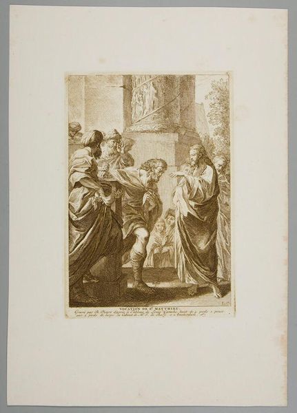 Editor: So, this is "Different Nations of Asia" by Louis Surugue. It’s hard to pinpoint the exact date, but he lived in the late 17th and early 18th centuries. It has such a staged, theatrical feel. What can you tell me about the cultural context of this image? Curator: It's fascinating how Surugue presents these figures. Given the title, "Different Nations of Asia," how do you think the artist engages with contemporary European views on the "Orient" and its people? Editor: That's interesting. I guess it's attempting some form of classification, but it feels a bit... detached. Curator: Precisely. It reflects Europe's growing interest in, and simultaneous distancing from, the East. It reveals much about the politics of representation. Editor: I hadn’t thought of it that way. It really makes you wonder about the power dynamics at play during this period. Curator: Exactly. Art is rarely just art; it’s a reflection of the world in which it was created and a powerful tool.
