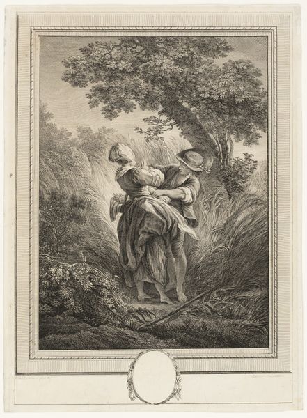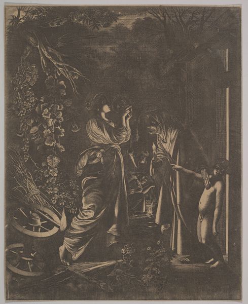 Editor: So, here we have François Jourd'heuil's "The Village Soothsayer," an engraving from 1762, now at the Met. There’s something a little unsettling about it, despite its rococo charm. The soothsayer’s gaze and touch seem…intrusive? How do you interpret this work? Curator: It's fascinating how you pick up on that tension. What I see is a visualization of the power dynamics inherent in knowledge itself. Consider the period. Who had access to literacy, to esoteric traditions, to financial stability? This engraving depicts the construction and commodification of female naivety within a patriarchal structure. Look at the women’s clothing. Does it communicate the socio-economic situation for all women at that time? Editor: So, the "soothsayer" isn't just some wise old man, but part of a system? I hadn't considered that he might be preying on them, or at the very least, benefiting from a structure of unequal power. Curator: Exactly! He's embodying a specific type of masculine authority, promising knowledge – perhaps about their futures, perhaps about love – in exchange for something. What that ‘something’ is, isn't made totally transparent, of course, but in the act of fortune telling, what’s he really extracting? Editor: This completely changes how I see it. Before, it felt like a quaint scene. Now, it feels like a critical commentary on class, gender, and exploitation. Curator: And doesn't that re-contextualization offer an infinitely richer, more nuanced reading of the work? Engaging with the art’s past, we gain clarity about its present cultural relevance. Editor: Absolutely. I'm realizing how important it is to question what seems ‘normal’ or ‘charming’ on the surface.