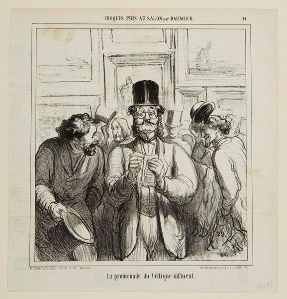 Curator: This is Honoré Daumier's "A Studio Visit," a lithograph that captures a somewhat awkward moment. The artist, known for his social commentary, highlights the performative aspects of art appreciation. Editor: My first thought is, "ouch," that looks like a critique I wouldn't want to be present for. The etching style gives it a nervous energy. Curator: Precisely! The cross-hatching isn't just technique; it adds to the tension, reflecting the unease of the artist showcasing labor to the critics. Editor: It's also about class, isn't it? The artist is showing his creation, and the visitors hold the power with their opinions. What a vulnerable position. Curator: Exactly. Daumier, through the print medium, democratizes this experience, making the artist's struggle widely accessible. Editor: Looking at it now, I see how the work invites us to consider the dynamic between creator, critic, and consumer. Very powerful stuff.