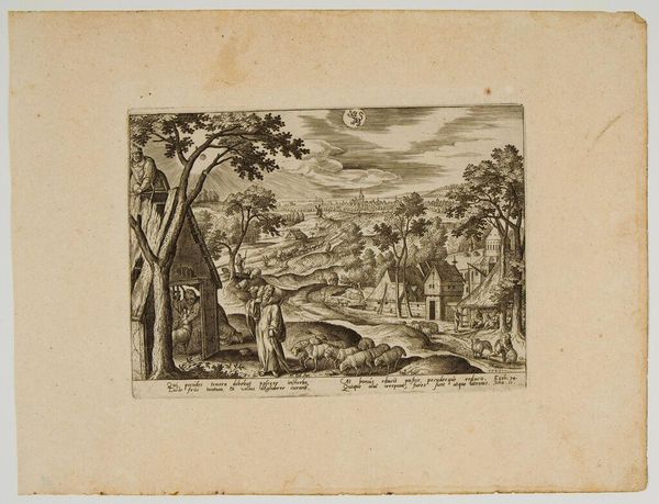 Curator: This is Aegidius Sadeler II's "September," currently residing at the Harvard Art Museums, rendered as a plate measuring about 20 by 28 centimeters. The medium emphasizes its linear qualities, doesn't it? Editor: Indeed. My first impression is of immense labor, of figures bent under the weight of harvest, a palpable sense of toil conveyed through the lines alone. Curator: Note the delicate hatching technique Sadeler employs to create depth and shadow, focusing the eye on the central figures while diminishing the background. Editor: Precisely. The composition subtly directs us to consider the materiality of the harvest itself, the baskets overflowing, the literal fruits of labor laid bare. Curator: The rendering of the foliage overhead and the constellation of Libra suggests a connection between earthly labor and the celestial order. Editor: I see a portrait of agrarian society. It is clear that Sadeler encourages us to consider the socioeconomic context of this image. Curator: A masterful blend of technique and allegory. Editor: A valuable lens through which to view labor and societal structures of the time.
