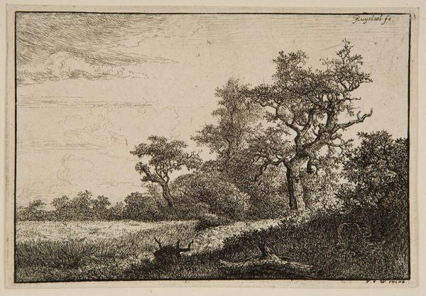 Curator: Johann Georg von Dillis created this small etching, titled "Decayed Tree Trunk," in the 18th or 19th century. Editor: The stark contrast between the dark lines and light background really highlights the texture of the decaying wood. It almost feels melancholic, like a memento mori. Curator: Yes, but look at the meticulous detail, the way he renders each individual blade of grass. It speaks to a deep engagement with the natural world and its processes. Consider the paper and ink he used. Editor: I am drawn to the image of the fallen tree itself. Trees often symbolize life, growth, and connection to nature, but here we see that symbolism inverted. Decay becomes the focal point. Curator: Perhaps, but decay is part of the cycle. And the skill with which Dillis depicts this cycle elevates it. Editor: I agree, and perhaps that is the lasting message. Dillis makes us think about the passage of time and its impact, not just on the natural world, but also on ourselves. Curator: Exactly, and to think, all achieved with simple paper and ink.