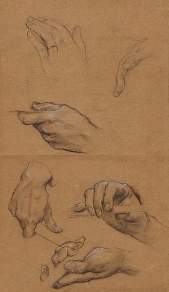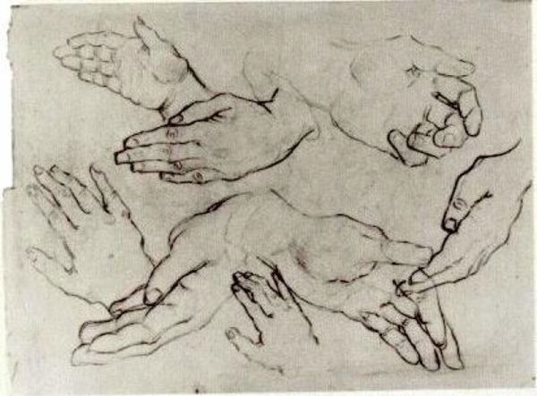 Editor: We’re looking at “Hands,” an 1885 drawing by Vincent van Gogh, currently held at the Van Gogh Museum in Amsterdam. There’s such an arresting quality to the sketch-like representation. What strikes you about this piece? Curator: The prevalence of hands—the many ways a hand may exist! It’s hard not to see a political dimension when one looks at how Van Gogh returns, obsessively it seems, to working hands and their expressiveness, particularly at a time of growing socialist consciousness. The dignity, but also the labor implied, raises complex questions about social class. Don't you think? Editor: Absolutely. Especially next to the figure using the pickaxe at the bottom; its a very strong, direct correlation of hard work and toil. Are there other factors to be taken into consideration to interpret these concepts? Curator: Well, think about what it meant to depict labor at this historical juncture, the power relations being expressed and questioned through art and political action. These images of labour often functioned as both observation and perhaps even propaganda. We could also investigate how this contrasts with the common themes used to create images of hands through Western art history, no? Editor: I see. By contrasting these depictions with traditional art, Van Gogh elevated the working class and humanized their daily struggles. The raw, sketch-like approach feels very intentional in communicating truth, which brings us closer to their humanity. Curator: Precisely. Van Gogh encourages us to examine not only what is represented but also how it is represented. These drawings act as a form of social commentary, drawing attention to the oft-unseen individuals. Editor: I see now a deeper intention for "Hands". Thank you for bringing these things to light. Curator: It's a two-way street! These works remind us of the artist's power and responsibility in portraying the lives of marginalized communities.