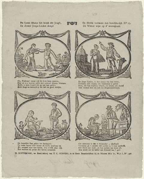 Curator: Here we have a print titled "De lent schetst het beeld der jeugd, / De zomer jonge-lieden deugd. / De herfst vertoont den huwelijks-tijd. / De winter wijst op d' eeuwigheid," created between 1820 and 1838 by Christiaan Jacob Schuyling. The artwork, crafted with drawing, pencil, and engraving on paper, reflects a Romanticist style and thematically explores genre-painting. Editor: Immediately, I'm struck by its compartmentalized, almost pedagogical arrangement. Four distinct oval scenes, likely representing the four seasons mentioned in the title, create a structured, didactic feeling. It's charmingly quaint in its presentation. Curator: The very structure directs our eye, prompting us to consider each vignette not just aesthetically but conceptually as well. We are invited to observe life’s progression: youth, adulthood, marriage, and old age reflected as the natural world cycles around us. The neat symmetry emphasizes order and purpose. Editor: And perhaps reveals certain societal expectations inherent to each of those stages. Notice the pairing of women and labor or domesticity. The ‘summer’ panel, for example, features a young woman giving food or clothing – potentially charity – to a seated figure. It’s easy to romanticize seasonality and natural processes, but this visual storytelling may communicate restrictive gender roles. Curator: From a purely visual standpoint, I appreciate how the artist uses line to differentiate the foreground from the background in each scene. Observe how details within each oval -- figures, architecture, landscape -- help generate depth. It demonstrates technical skill despite the small format. Editor: That’s valid, though my reading is influenced by where and when the work originates. Knowing the piece comes from Rotterdam, we can contextualize it against that period's emphasis on domestic virtues and civic responsibility. Are the details supporting artistic excellence, or endorsing existing socio-economic inequalities? Curator: Do you suggest an aesthetic deconstruction diminishes its possible sentimental appeal? It speaks directly using allegory that moves beyond a temporal association. Note how the work’s physical materiality is both decorative and instructional. Editor: I agree that the cyclical presentation is appealing. Schuyling seems to comment on continuity as well as expectations. My perspective is to invite examination of assumptions or implications through that lens. Curator: Thank you for enriching this analysis by highlighting those layers. It underscores art's unique capacity to be beautiful and meaningful across timelines. Editor: Likewise. Looking more attentively prompts me to note the engraving offers an instructive look, quite literally offering lessons in life to whomever might stop and see themselves and their own world reflected.