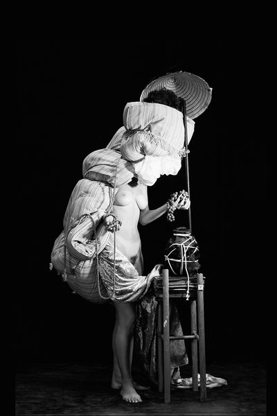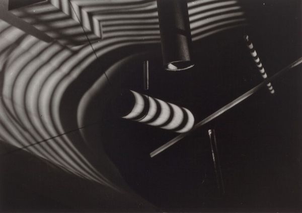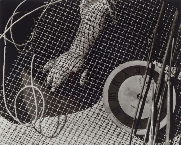 Curator: At first glance, this black and white photograph, "Walking Camera I (Jimmy the Camera)," from 1987, projects a rather unsettling mood. Editor: Unsettling is right. The stark contrast and the slightly tilted composition contribute to a sense of unease, as if reality is skewed. What strikes me first is the odd juxtaposition of human legs emerging from what appears to be an oversized, antiquated camera. Curator: Indeed. Laurie Simmons seems to be commenting on the mechanization of perception. We see this play between the organic and inorganic—flesh and metal, creating a hybrid that's both humorous and slightly grotesque. The image presents a unique perspective on the role of technology in shaping how we view ourselves and the world. What kind of labor went into making the materials? Where was it consumed? Who is this image for? Editor: I’m intrigued by the form itself. The heavy camera body perches precariously on those slender legs. It’s as if Simmons is questioning the very structure of the photographic apparatus. It seems quite unstable, and thus symbolic in many ways. How solid is our visual documentation of life? What biases do these forms inevitably entail? Curator: The question of visibility is key. Note the angle, placing the viewer in a position of surveillance, potentially critiquing how photography historically held power over its subjects by commodifying images and freezing people, moments, and communities into exploitable resources. Editor: Precisely. The surreal blending of human and machine prompts a deeper questioning of the photographic process, too. The human element, or rather its bizarre adaptation, reveals our dependency on these tools of mediation. Curator: These works force us to confront the material circumstances around the labor, class, and resources that enable art practices such as photography, and what their role in our society actually is. Editor: Agreed. Simmons masterfully challenges our preconceived notions about photography as objective documentation. This strange dance of form and function offers layers of interpretation that stay with you long after viewing. Curator: And that uneasy resonance reveals more about the means and consumption of photography. Editor: A clever subversion realized in compellingly odd composition.