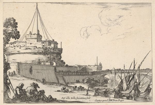 Curator: Isn't it extraordinary how an etching, a print, can capture so much life? This is "Castel Sant'Angelo en de Ponte Sant'Angelo in Rome" by Francesco Barbazza, dating roughly from 1775 to 1785. Look at the detail he manages to convey with simple lines and shading. Editor: The texture! It's all so finely rendered; it practically begs to be touched, even though it's obviously just paper. And the atmosphere! It has a bustling feel. A sense of antiquity mingling with daily life. Curator: That bustling feeling is intentional, I think. These kinds of cityscapes, especially in the Baroque period, were all about conveying the grandeur and vitality of Rome. They acted almost like postcards for wealthy tourists. Editor: Postcards for the 18th-century elite, huh? Clever marketing! Makes you wonder about who commissioned it. I'm also thinking about the composition, with that somewhat imposing Castel Sant’Angelo looming large. Is it meant to emphasize power, permanence? Curator: Precisely. The Castel Sant’Angelo started as Emperor Hadrian's mausoleum, then became a papal fortress. So Barbazza is drawing on centuries of Roman history and layering on top of that, ideas of power and religious authority. Editor: And the bridge, the Ponte Sant’Angelo. Absolutely teeming with figures! The river seems equally active with working people on boats doing...what exactly? Curator: Probably ferrying goods, maybe even waste, given the period. Remember, these prints weren't just about showing off beautiful architecture; they also showed the economic life of the city, however romanticized. What really gets me are those sculptures lining the bridge. A touch of the celestial, isn't it? Editor: A heavenly procession leading toward the earthly power… it's staged, theatrical. Although...I find myself far more interested in those little vignettes of everyday Roman life at the bottom. I like the raw energy, I think, as if pulled directly from the real world. Curator: That interplay between the monumental and the mundane, that tension is where the true magic lies. It allows the viewer to contemplate Rome, its past and present all in one glance. Editor: A captivating glimpse into a layered history. One that definitely has me itching to be in Rome now!