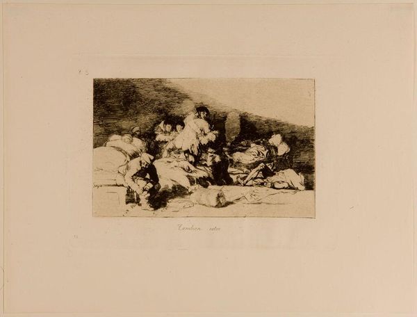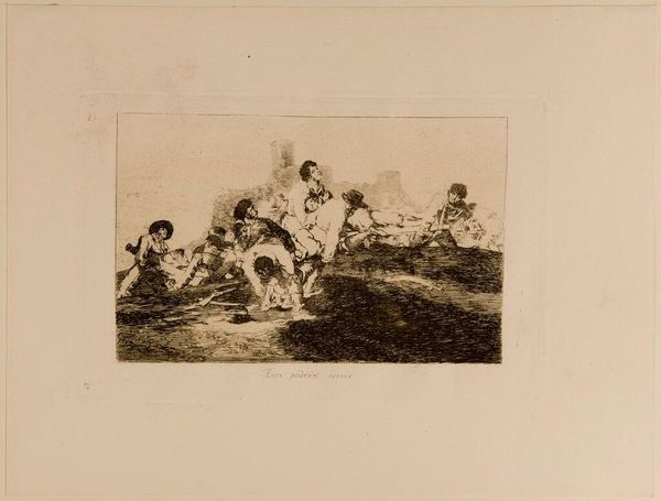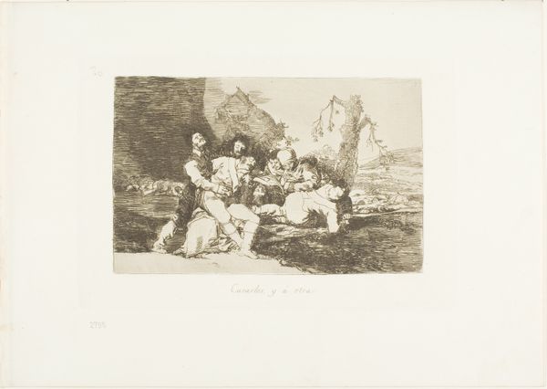 Editor: This etching is called "Heal Them and On to the Next" by Francisco Goya. It seems to depict injured people, maybe soldiers, being tended to. What do you see in this piece beyond the immediate suffering? Curator: This work, like much of Goya's "Disasters of War" series, presents a stark indictment of conflict. Consider the title: "Heal them and on to the next." It speaks volumes about the dehumanization inherent in warfare. Goya uses the aquatint technique to create a haunting atmosphere, emphasizing the cyclical nature of violence and the indifference to individual pain. How might this image resonate with contemporary issues of war and its aftermath? Editor: I see now how Goya critiques the systemic disregard for human life in war. It's a bleak but powerful statement. Curator: Exactly. And it forces us to confront uncomfortable truths about power, exploitation, and the enduring cost of conflict. It challenges the narratives we tell ourselves about progress and civilization.
