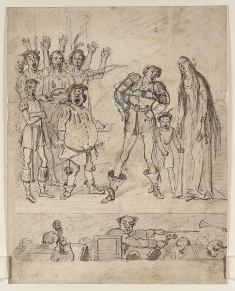 Curator: This is a fascinating work by Thomas Stothard, titled ‘Sketch for Illustration to Bowyer’s ‘History of England’: Studies for ‘The Crown Offered to Oliver Cromwell’... and on the other side, studies of heads and death-bed scenes. Editor: My first impression is that there's a restless energy here, almost frantic. It’s as if Stothard is trying to capture fleeting ideas before they vanish. Curator: Absolutely. He’s grappling with momentous historical events – the offer of the crown to Cromwell, death scenes – which all carry such potent symbolism. The crown, of course, signifying power and legitimacy. Editor: And the death scenes? Do you see them as a memento mori, a reminder of mortality juxtaposed against Cromwell's potential kingship? Curator: Perhaps. Or Stothard might be contrasting the power struggles with the inevitable end we all share. Seeing these sketches together gives insight into how an artist’s mind works. Editor: It makes me wonder what details he eventually chose to emphasize in the final illustration. Curator: Precisely. It's like peeking behind the curtain of history. Editor: Stothard’s explorations certainly prompt reflections on the ephemeral and the enduring. Curator: Agreed, I find something deeply human about witnessing an artist at work trying to capture the essence of such heavy moments.