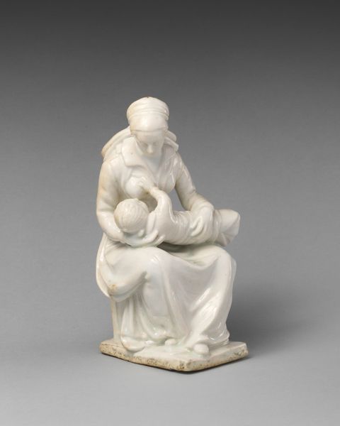 Curator: This arresting sculpture is "Hannah Moore," created around 1830 by Herbert Minton and Company. It’s crafted from delicate porcelain. Editor: I find it incredibly serene. The whiteness of the porcelain, the way the light catches the folds of her dress—it almost glows with an inner peace. There’s a profound stillness in her posture. Curator: Hannah More was a prominent religious writer, philanthropist, and abolitionist in England during the late 18th and early 19th centuries. Her work advocating for education and social reform places her firmly within a network of female intellectuals pushing for systemic change. Editor: Absolutely, and I notice a certain symbolism at play here. The book at her feet, signifying her literacy and intellectual contributions, alongside her relaxed yet upright pose which speaks to strength. Her bonnet frames her face, yet doesn't hide it; it acknowledges tradition, but also speaks of a clear vision. The piece speaks to cultural shifts in depictions of women, shifting power dynamics and rising visibility of women who chose intellectual life, right? Curator: Precisely! Considering More’s position within religious circles and the rising abolitionist movement, her intellectual prowess allowed her to create resources, like plays and pamphlets, that served as the backbone of social transformation. As literacy became further intertwined with social mobility, this sculpture acts as a historical record to shifts in societal value. Editor: It's fascinating how an object, even one seemingly delicate as this, can embody such resolute presence. White often speaks of innocence, but in this context, the uniformity amplifies focus. There's a clear vision within Hannah, mirroring society’s turn from chaos to organization, reflected perhaps in this artwork's aesthetic simplicity. It reminds me of classical busts but reinterpreted. Curator: I agree. Her lifework dedicated to shaping future generations definitely resonates within a piece such as this. Examining art through interdisciplinary studies of historical narratives grants us greater awareness of not just past actors, but of present day dynamics. Editor: I hadn't initially considered the socio-political ties so deeply. I was mostly caught by her quiet resilience. I feel I leave this piece with greater contemplation of the depth within symbols and form.