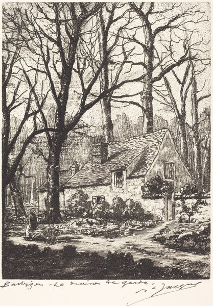 Jacobus Ludovicus Cornet created this small etching, 'Bocht langs een rivier', sometime in the mid-19th century. Notice how the intricate network of lines defines the shapes and textures of the buildings, trees, and landscape. The composition pulls us into a winding path alongside a river, directing our gaze from the lower right corner towards a quaint cottage nestled among bare trees. Cornet's use of etching to render this scene speaks to a broader artistic interest in realism and the detailed observation of nature. The meticulous cross-hatching and fine lines not only depict the physical textures of the thatched roofs and rough bark but also evoke a sense of atmosphere. This emphasis on detail creates a tension between the artwork as a representation and as a constructed image. Consider how Cornet's etching transforms the natural world into a series of coded marks. The river's bend isn't just a geographical feature but becomes a signifier of movement, guiding us through the scene. This etching invites us to consider how art mediates our perception of reality, turning landscapes into carefully structured arrangements of lines and tones.
